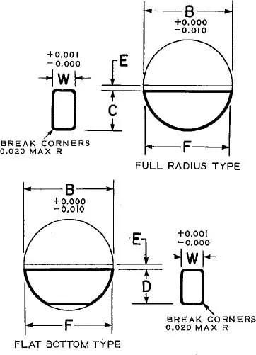 Flat-bottoms have a similar profile as the full-radius keys, but the bottom section is actually flat instead of being rounded. The dimension of the bottom is also a standardized measurement and depends on the key number, though several part numbers may share the same bottom measurements.